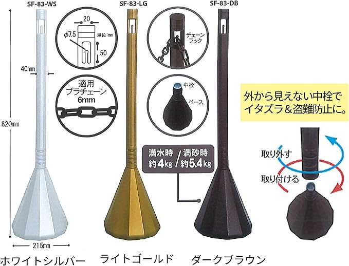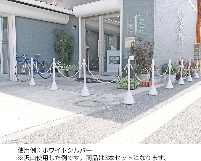 ・3組セット商品です。すぐにお使いになれます。 ・駐車場や区画整備のどんな景観にもマッチする高級感のあるデザインのチエーンスタンド。 ・ポールとベースを同色にし、上品で落ち着いた印象です。 ・ベースに水や砂を入れて重石になります。 ・外から見えない中栓でイタズラ&盗難防止になります。