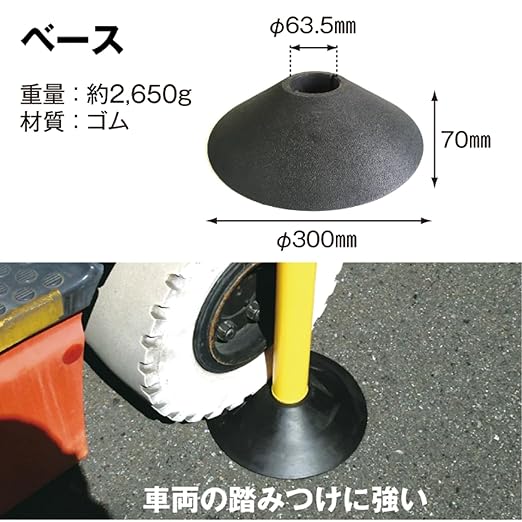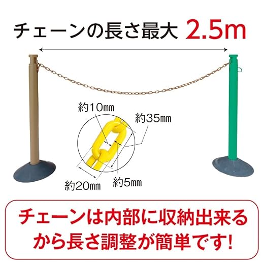 本体内部にチェーンを内蔵しているので、好きな長さだけ引き出してチェーンを張れます。チェーンは好きな長さでひっかけられるので垂れ下がらないです。チェーンの長さは2.5M。ベースは車両が踏んでも壊れないゴムベース。ポールとベースのセット品です。