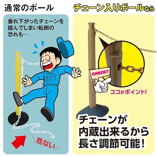 ●チェーン内蔵式のプラスチックポール。壊れにくいゴムベースタイプなので丈夫です。