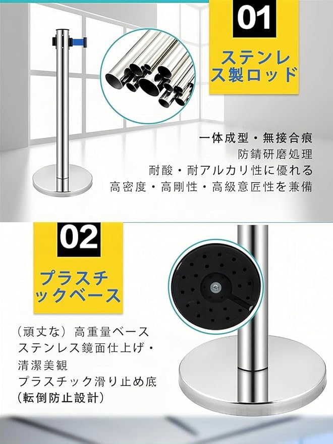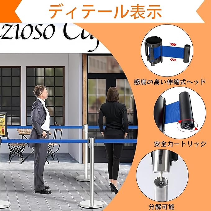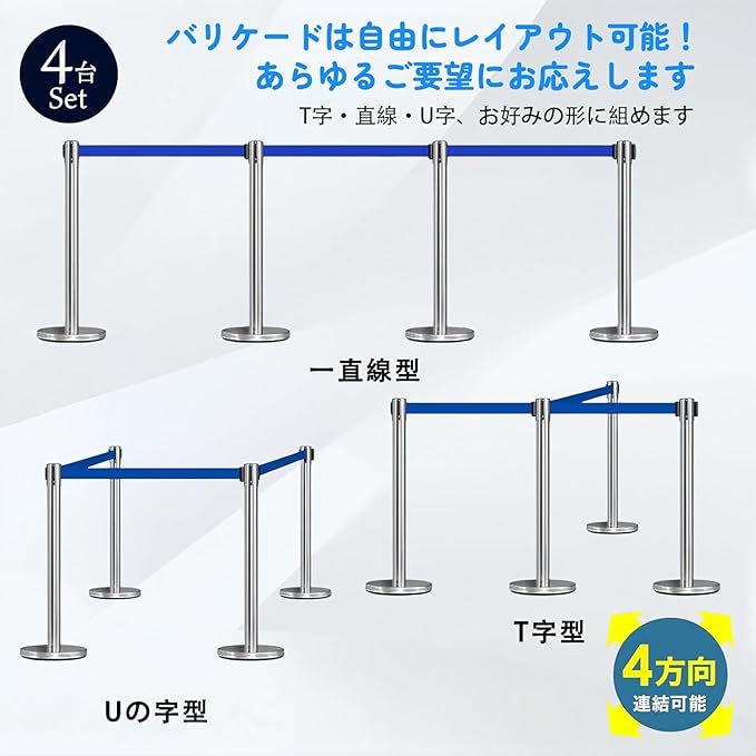 【カスタマイズ自在な4ベルト連結システム】:4本セットのベルトを前後左右に自由に連結可能。混雑時の人流整理、エリア分け、展示ブースの仕切りなど、様々なシチュエーションに柔軟に対応。単体でも複数連結でも使い勝手抜群で、効率的な空間管理を実現します。