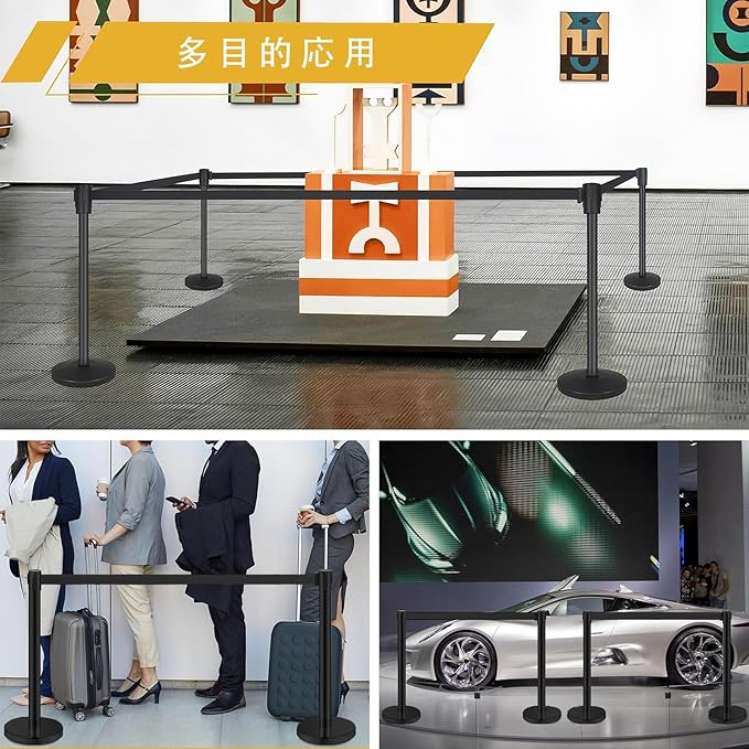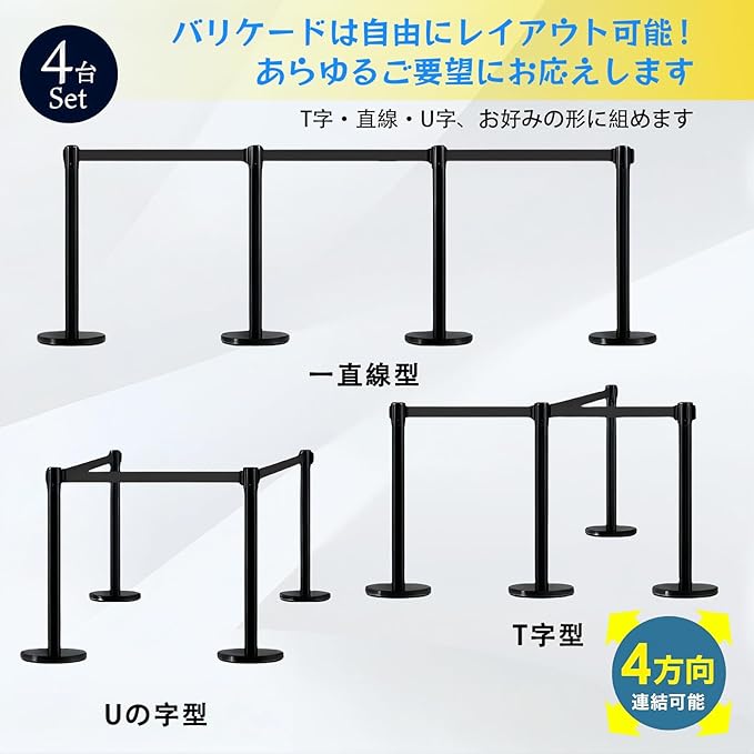 【カスタマイズ自在な4ベルト連結システム】:4本セットのベルトを前後左右に自由に連結可能。混雑時の人流整理、エリア分け、展示ブースの仕切りなど、様々なシチュエーションに柔軟に対応。単体でも複数連結でも使い勝手抜群で、効率的な空間管理を実現します。