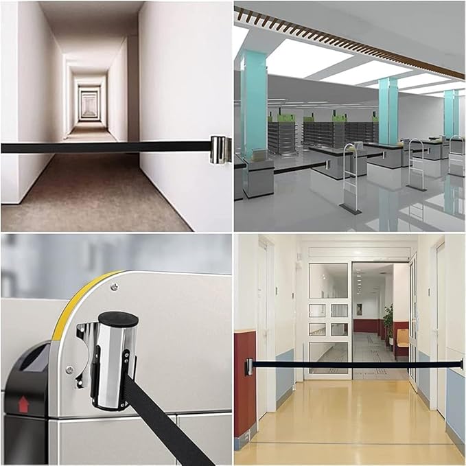 【設置可能な場所】: バリアベルトは出入り口、廊下、通路、倉庫のラック、チェックアウトスタンド、ロールアップ出入り口、ガレージドアの入り口などに最適です。