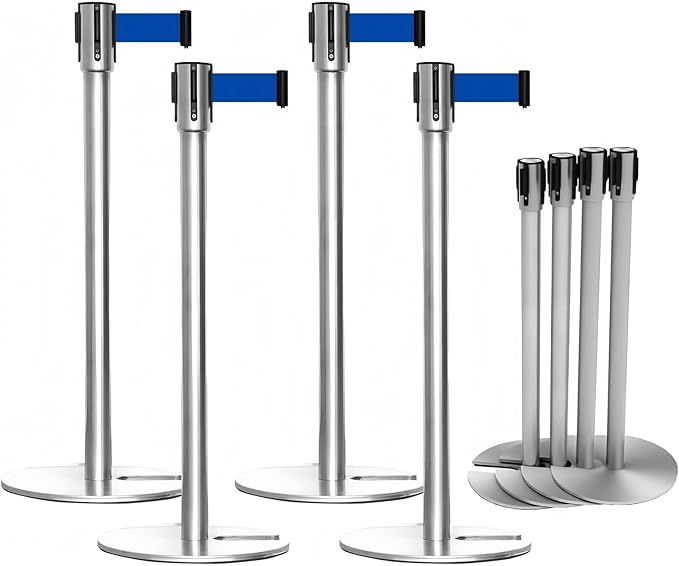ベルトパーテーション ステンレス鋼 4本セット4方向連結 自動巻取りポールパーテーション Uベース 重ねて収納できる シルバーポールxブルーベルトベルト長さ約2m 支柱 ベルトパーテーション 行列の整理や誘導に大活躍