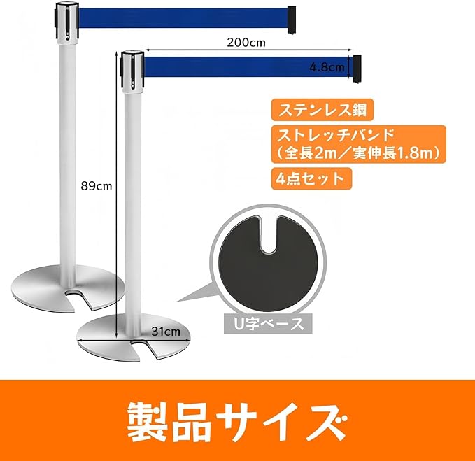 【カスタマイズ自在な4ベルト連結システム】:4本セットのベルトを前後左右に自由に連結可能。混雑時の人流整理、エリア分け、展示ブースの仕切りなど、様々なシチュエーションに柔軟に対応。単体でも複数連結でも使い勝手抜群で、効率的な空間管理を実現します。