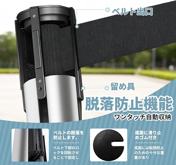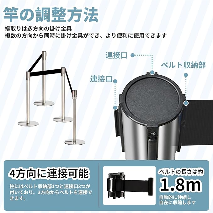 【カスタマイズ自在な4ベルト連結システム】:4本セットのベルトを前後左右に自由に連結可能。混雑時の人流整理、エリア分け、展示ブースの仕切りなど、様々なシチュエーションに柔軟に対応。単体でも複数連結でも使い勝手抜群で、効率的な空間管理を実現します。