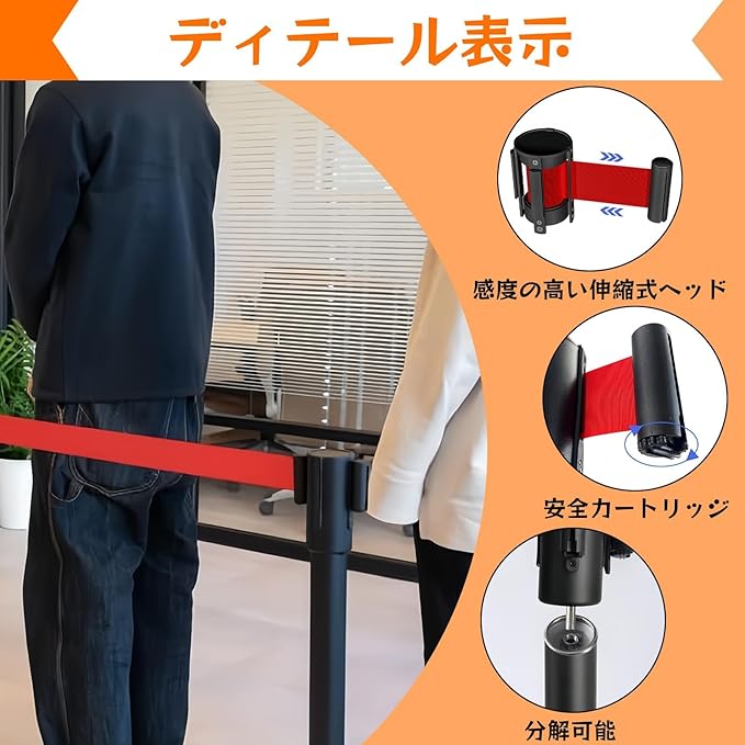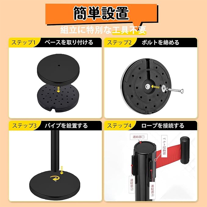 【カスタマイズ自在な4ベルト連結システム】:4本セットのベルトを前後左右に自由に連結可能。混雑時の人流整理、エリア分け、展示ブースの仕切りなど、様々なシチュエーションに柔軟に対応。単体でも複数連結でも使い勝手抜群で、効率的な空間管理を実現します。