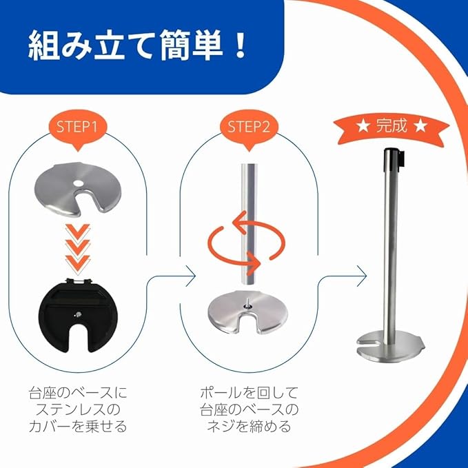 工具無しで簡単組み立て - ベルト付きポール部分を台座に差し込むだけで、工具を使わず簡単に組み立てていただけます。
