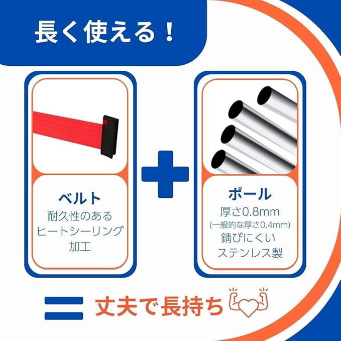 耐久性 - ヒートシーリング加工済みの強力なナイロン製ベルトや、ステンレス製 の錆びにくいスチールポールを使用しており、摩耗や損傷に耐えられるよう各部位にこだわって作られているので、長くご愛用いただける、高品質のベルトパーティションです。