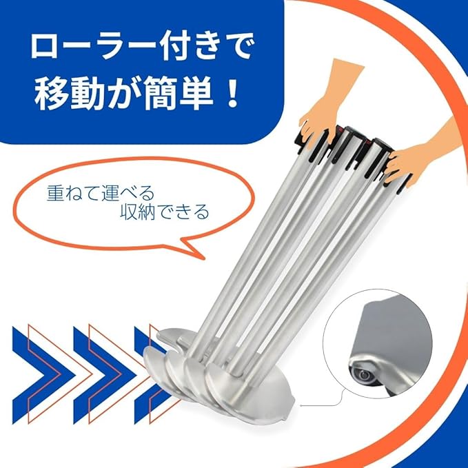 便利な機能満載 - ローラー付きなので持ち上げる必要がなく、転がして移動が可能です。最大4本のスタッキングが可能で、収納時には積み重ねてスペースを節約。重ねたまま転がして移動することもできるので、時間と場所の節約になります。さらに4方向へ連結が可能で、様々な広さ、用途に対応。列整理や仕切り、侵入防止など、あらゆる目的でご利用いただけます。ベルトの長さは一般より長めの作り(約3メートル)になっており、本数を節約できます。