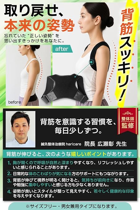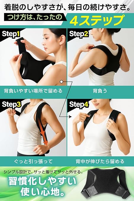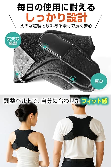 【Mサイズ・調整可能】 伸縮性のベルトで、標準的な体型にぴったりフィット。猫背や巻き肩が気になる方におすすめです。