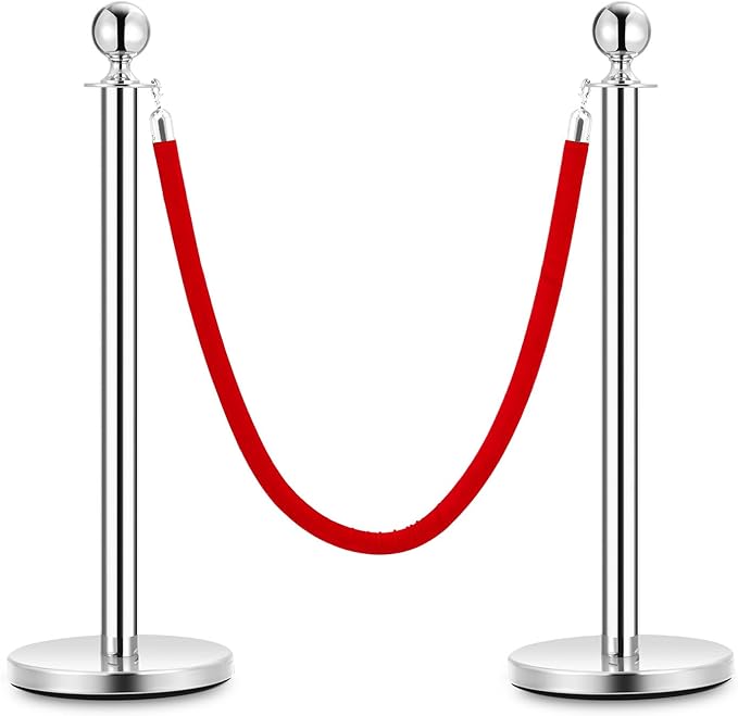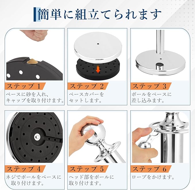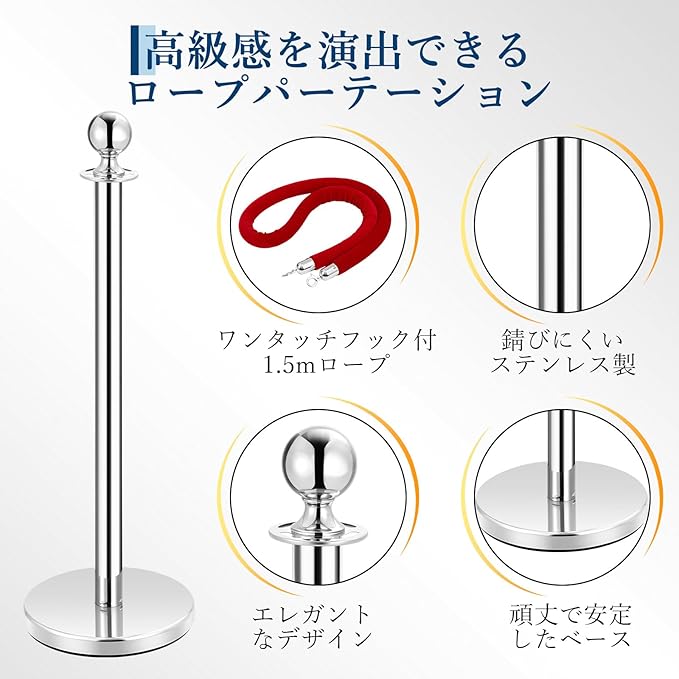 ガービー(Garvee) ロープパーテーション セット ステンレス製 長さ1.5 m 高さ95 cm 組み立て簡単 ポール2本 ロープ1本 ガイドポール ポールスタンド もこもこ シルバー