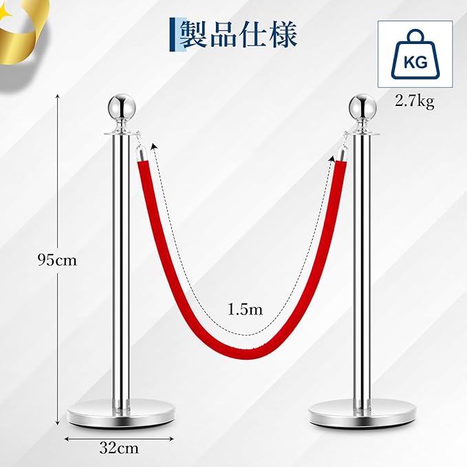 【製品仕様】長さ1.5 m 高さ95 cm ステンレスポール2本 専用ロープ1本付属