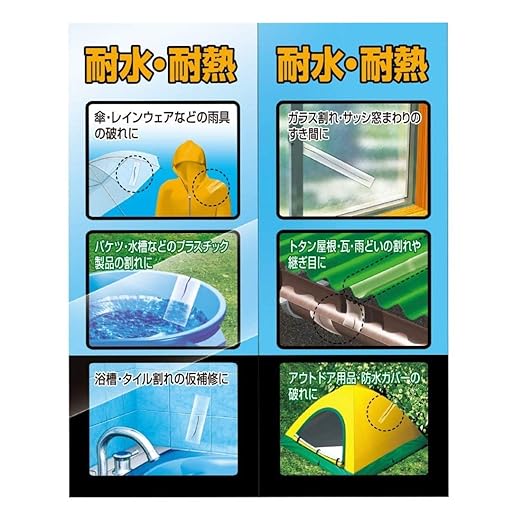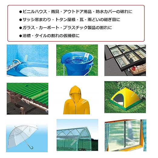 ・広範囲の材料にもビニルハウス・雨具・アウトドア用品・防水カバーの破れ、サッシ窓まわり・トタン屋根・瓦・雨どいの継ぎ目など