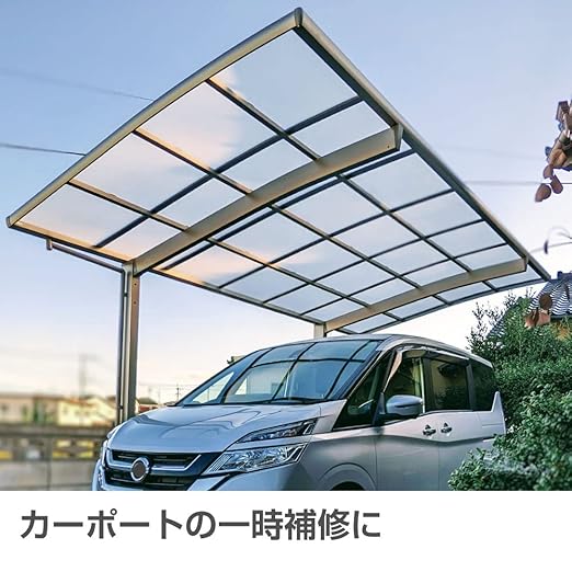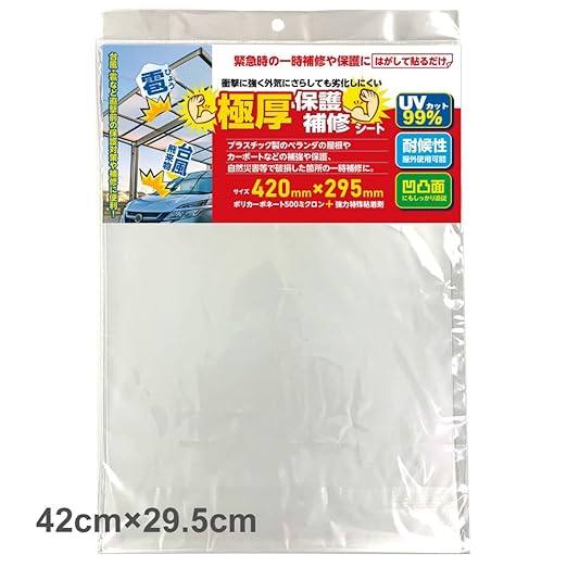 粗面や凹凸面に貼れる強力 保護・補修シート ●サイズ:420mm 295mm (1枚入り) ●シートの厚み:500ミクロン(0.5mm) ●耐候性、耐熱性(耐熱温度80℃)に優れています。 ●屋外のポリカーボネート製カーポート破損の一時補修に
