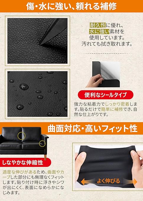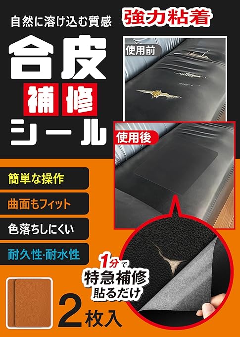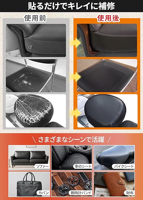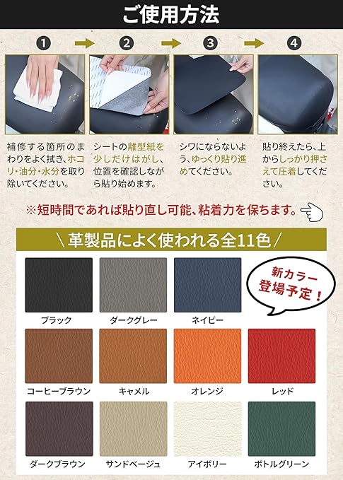 【幅広く使える・家具から日用品まで対応】ソファ・椅子・車やバイクのシート・自転車のサドル・バッグ・財布など、幅広い合皮製品の補修にお使いいただけます。破れ・キズ・はがれのケアに便利で、DIY用途にも活躍します。近い色味を選べる豊富なカラーバリエーションで、自然な仕上がりを実現します ※モニターの表示環境や設定の違いにより、実際の色味と多少異なって見える場合があります