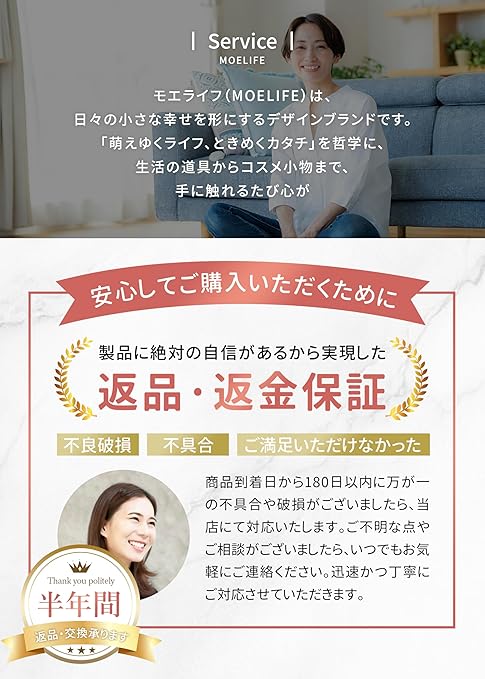 【MOELIFE・心強いサポート】日本限定商品として、製品の開発から製造、検品、配送に至る各段階で、高水準の品質基準を遵守しています。六ヶ月のサービスが付き、使用後でも製品による不具合は迅速に責任を持って対応いたします。信頼度の高いカスタマーサポートを提供いたします