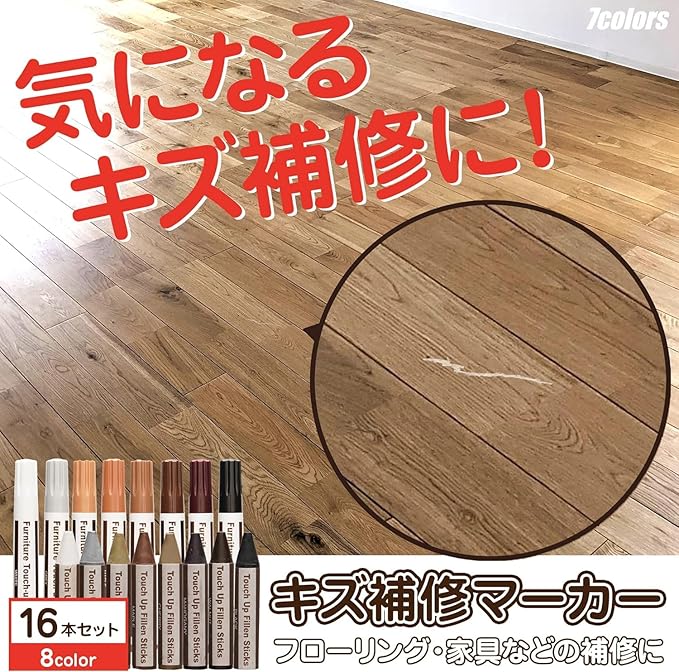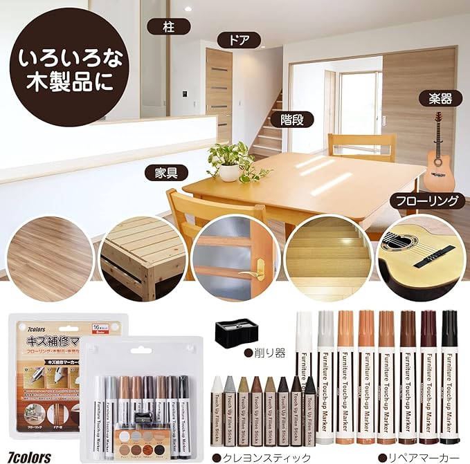 7colors キズ補修マーカー 傷補修キット 補修ペン フローリング 木製家具 床 ドア 修復 クレヨン キズ消し キズ隠し 剥がれ 穴埋め 削り器付き(8色入り・16本セット)
