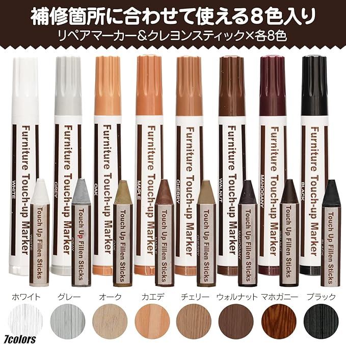 【家のあらゆる場所で活躍】 いろいろな木製品の色に合わせて使い分けられる8色セットで、用途は無限大です。フローリングや木製家具(テーブル、椅子、キャビネット、ベッド、クローゼット、本棚、机など)だけでなく、ドア、柱、階段、ウッドデッキ、ギター等の楽器など、様々な場所に対応しています。傷、擦り傷、ひび割れ、へこみ、剥がれ、汚れ、変色などを隠すのに役立ちますので、気になる部分にぜひお使いください。