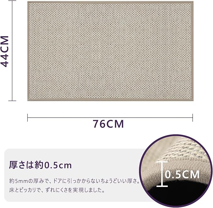 【薄型設計でも耐久性】厚み約5mmの薄型設計で扱いやすく、しっかりとした素材感で耐久性にも配慮しています。厚みを抑えているため、ドアの開閉を妨げにくく、つまづきにくいのもポイント。季節を問わず、玄関用マットとして一年中お使いいただけます。