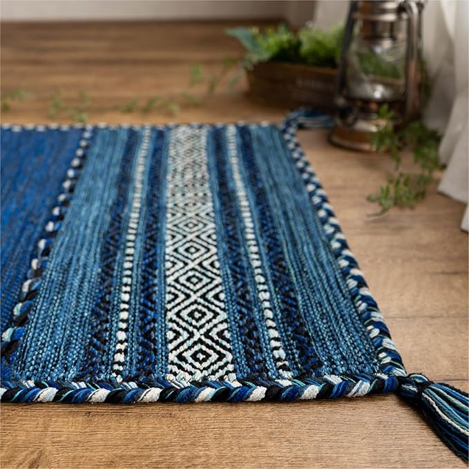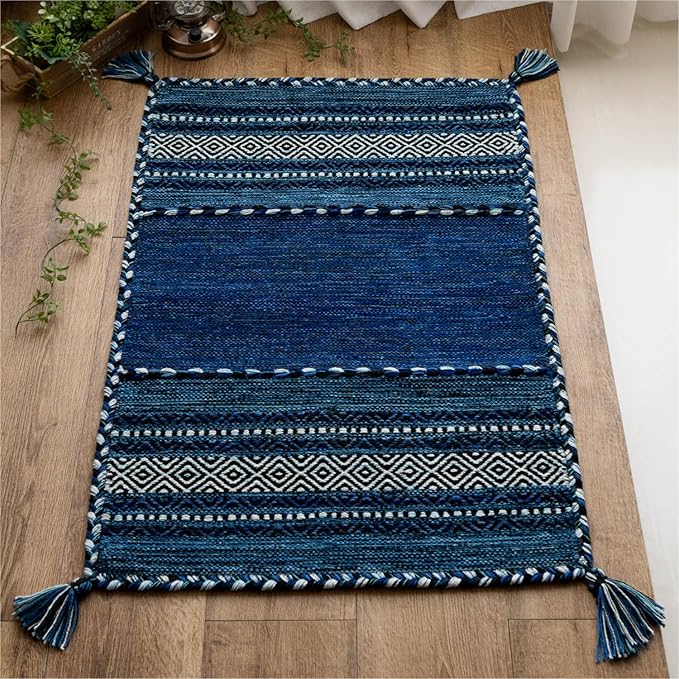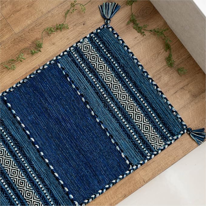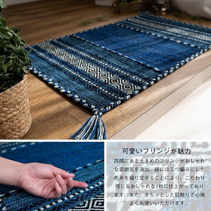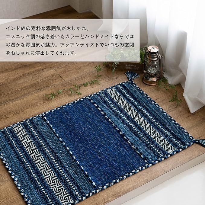 サヤンサヤン 手織り 幾何学柄 アジアン 玄関マット 屋内 室内 インドキリム 50x80 ブルー