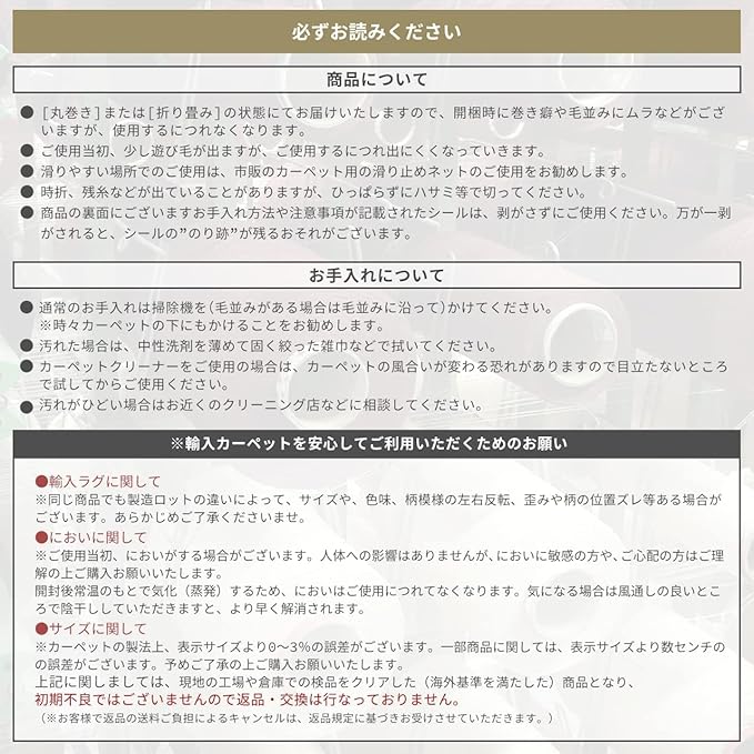 【輸入カーペットを安心してご利用いただくためのお願い】 ●輸入ラグに関して ※同じ商品でも製造ロットの違いによって、サイズや、色味、柄模様の左右が反転していたり、位置がズレている場合がございます。ただし、現地の工場や倉庫での検品をクリアした商品を輸入しています。あらかじめご了承くださいませ。/ ●においに関して ※ご使用当初、においがする場合がございます。人体への影響はありませんが、においに敏感の方や、ご心配の方はご理解の上ご購入お願いいたします。開封後常温のもとで気化(蒸発)するため、においはご使用につれてなくなります。気になる場合は風通しの良いところで陰干ししていただきますと、より早く解消されます。/ ●サイズに関して ※カーペットの製法上、表示サイズより” 数センチ ”の誤差がございます。/ ※裏面に製品シールがある場合は剥がさないでご使用ください。