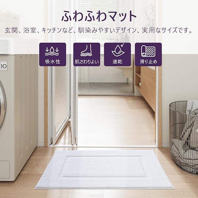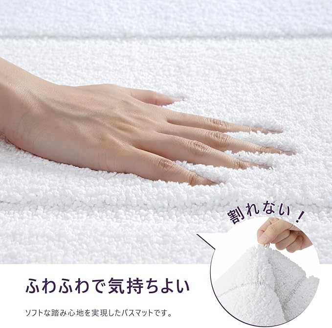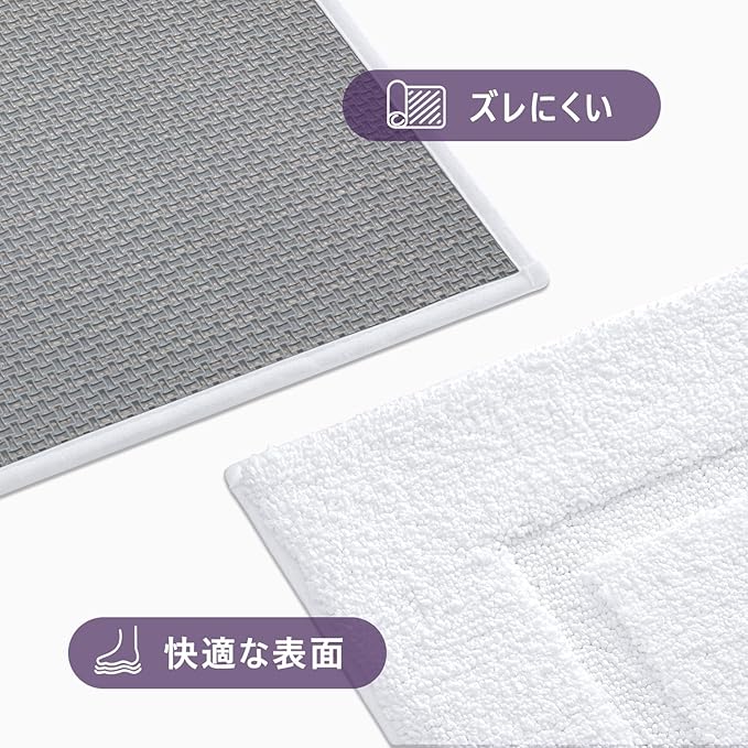 【ふわふわで一年中快適】ソフトなマイクロファイバー素材を使用したこのバスマットは、ふかふかでやさしい肌ざわり。足を乗せると、柔らかな毛足が足裏を包み込み、心地よい踏み心地を感じられます。優れた吸水性と速乾性で夏はさらっと爽やか、冬は冷たさを感じにくく、一年中快適に使用できます。