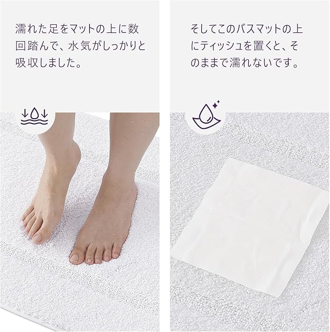 【高い吸水性&速乾】お風呂上がりの足も、マットに乗せるだけで水分をすばやく吸収。さらに速乾性も高いため、足元も浴室のフロアも乾いた状態を保ちます。