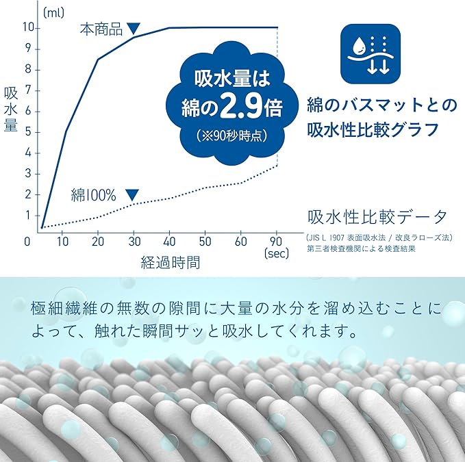 お風呂上がりの足に付いた水滴を、踏むだけでサッと吸水。吸水量は綿の2.9倍!裏返して両面使えるので、毎回さっぱり気持ちよく使えます。