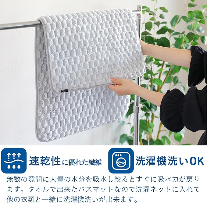 ジメジメした梅雨時期や真冬の洗濯でも乾きやすいので、お洗濯も楽々。気軽に洗って使えるバスマットです。※色落ちする可能性があります。最初の3~4回は必ず洗濯機で単独洗いをして下さい。