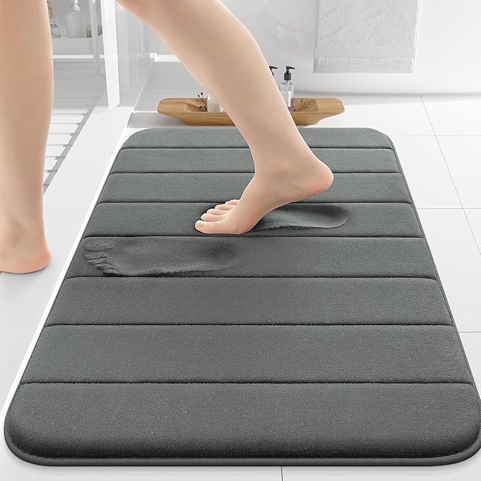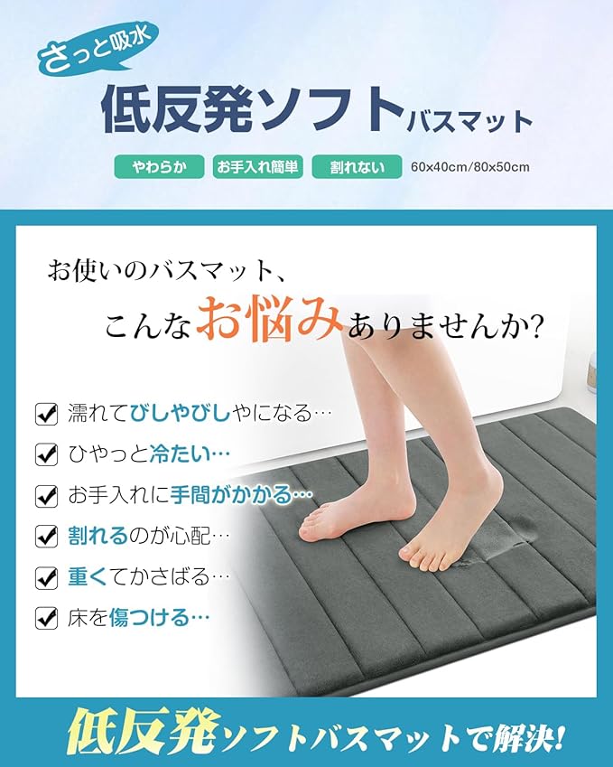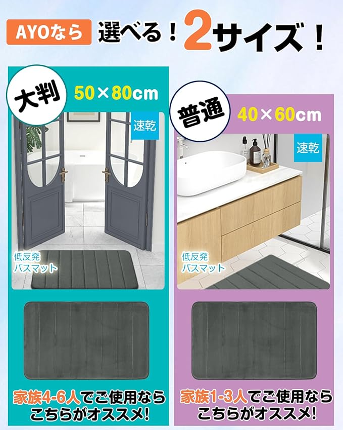 バスマット AYO(エイワイオー) 速乾 吸水 お風呂マット ふんわり 低反発足ふきマット 洗える 滑り止め ソフトタッチ 洗濯 台所 脱衣場 キッチン 玄関やわらかマット(グレー 40*60㎝)