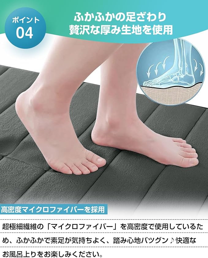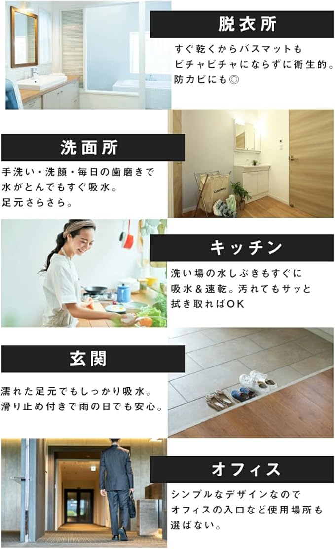 【シンプルデザインて場所を選ばない】機能性や肌ざわりも抜群なのでいろいろな場面で大活躍してくれます。滑りやすい水回りはもちるんですが、人の出入りの多い玄関やリビングのアクセントマットとして、日常のあらゆるシーンでご利用いただけます。対応場所は多く:玄関、廊下、洗面台、寝室、ダイニングルーム、浴室、バスルーム、キッチンなどです。