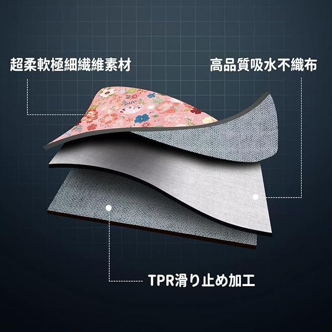 【安心の滑り止め加工】トイレマットの裏地には、不織布とTPR(熱可塑性ゴム)を組み合わせた素材を採用しています。シャワーの後に床が濡れたり、お年寄りや子どもが素早く動いたりしても、マットはしっかりと床に固定され、足元がふらつく心配を解消してくれます。さらに、不織布の透湿性が働いて、お手入れ後の湿気をスムーズに逃がしてくれるため、マットの裏側がベタついたり、異臭が残ったりすることも少なく、いつでも清潔な状態を保てます。