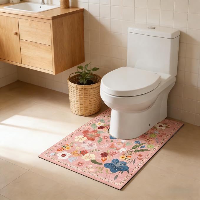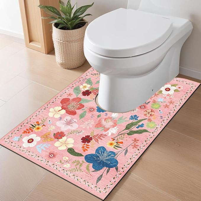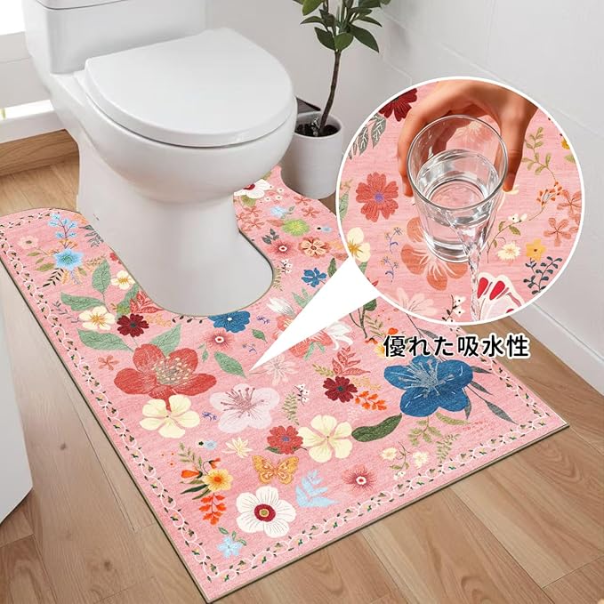 トイレマット ロング 耳長 花柄 洗える: 人気 おしゃれ 吸水速乾 ふわふわ 抗菌 防臭 滑り止め 可愛い 和室風 toilet mat 大判 トイレ用カーペット U型 60x90cm (ピンク)