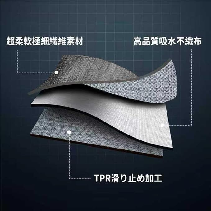 【安心の滑り止め加工】トイレマットの裏地には、不織布とTPR(熱可塑性ゴム)を組み合わせた素材を採用しています。シャワーの後に床が濡れたり、お年寄りや子どもが素早く動いたりしても、マットはしっかりと床に固定され、足元がふらつく心配を解消してくれます。さらに、不織布の透湿性が働いて、お手入れ後の湿気をスムーズに逃がしてくれるため、マットの裏側がベタついたり、異臭が残ったりすることも少なく、いつでも清潔な状態を保てます。