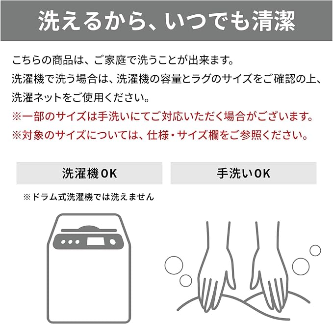 ※ドラム式洗濯機では洗えない場合があります。洗濯機の説明書をご確認ください。●ご家庭で洗濯ができます。洗濯機で洗っても大丈夫です。