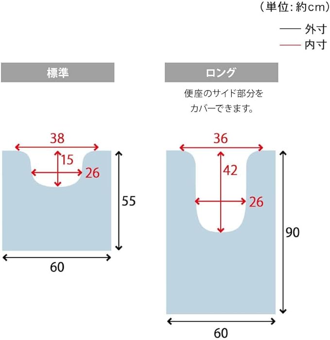 ■トイレマットサイズ/<標準>幅約60 奥行約55cm、くぼみ深さ約15 くぼみ幅(最大)約38cm、くぼみ幅(中央)約26cm、<ロング>幅約60 奥行約90cm、くぼみ深さ約42 くぼみ幅(最大)約36cm、くぼみ幅(中央)約26cm