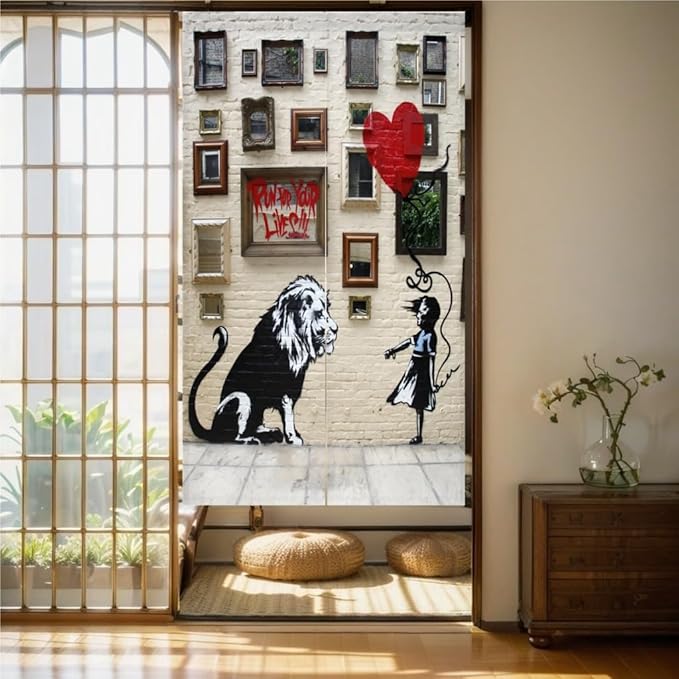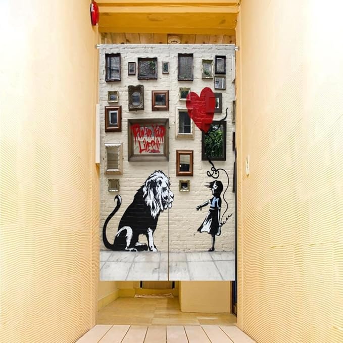 のれん 暖簾 バンクシー ゆ 温泉おしゃれ 遮光 北欧 簡単 目隠し 見えにくい 玄関 温泉 旅館 ホテル 廊下 お風呂 洗面所 トイレドアカーテン キッチン リビング 飲食店 出入り口 幅85丈120cm,ライオン