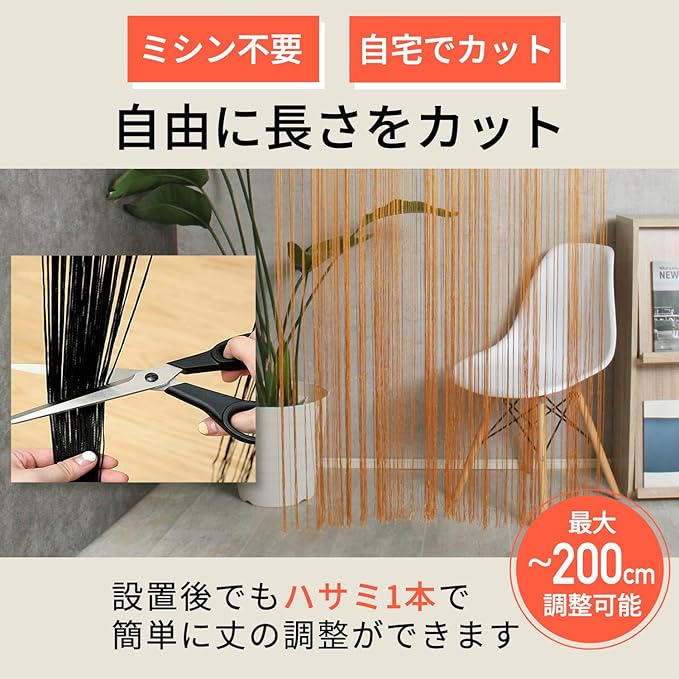 [KJ] ストリングカーテン 間仕切り 紐のれん 洋風すだれ フリンジ 暖簾 高さ200cm 横100cm おしゃれ インテリア タペストリー (ブラック, 通常)