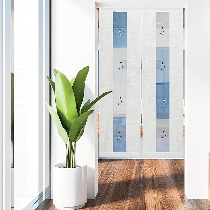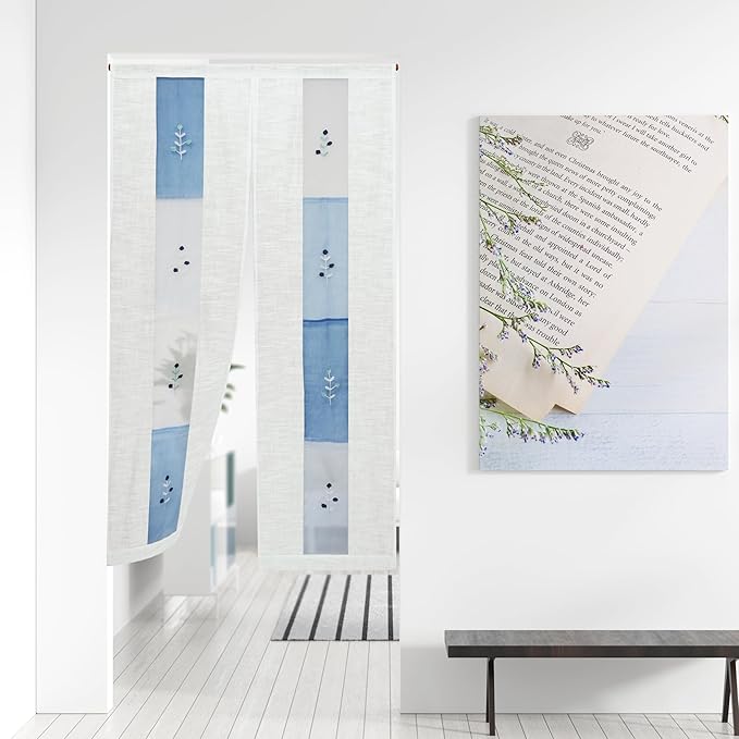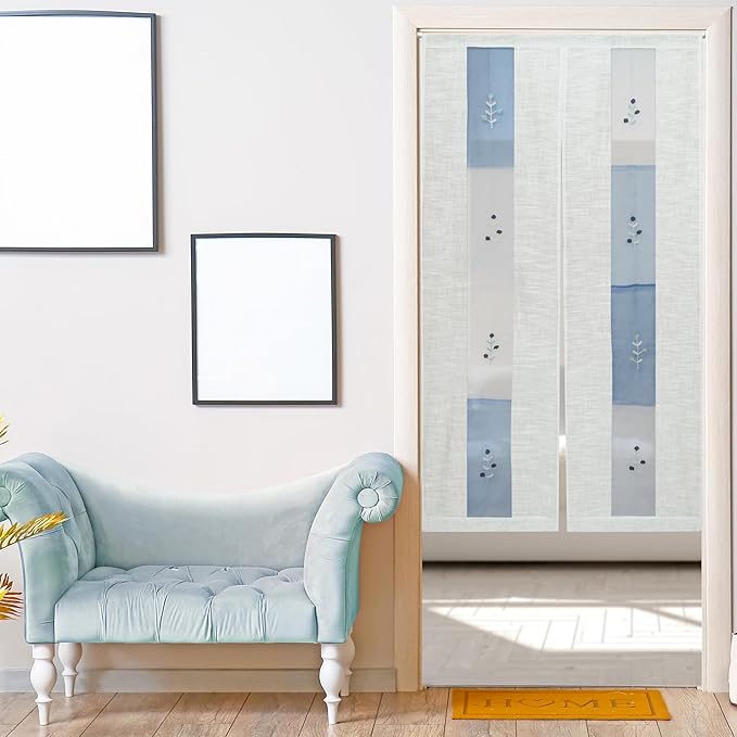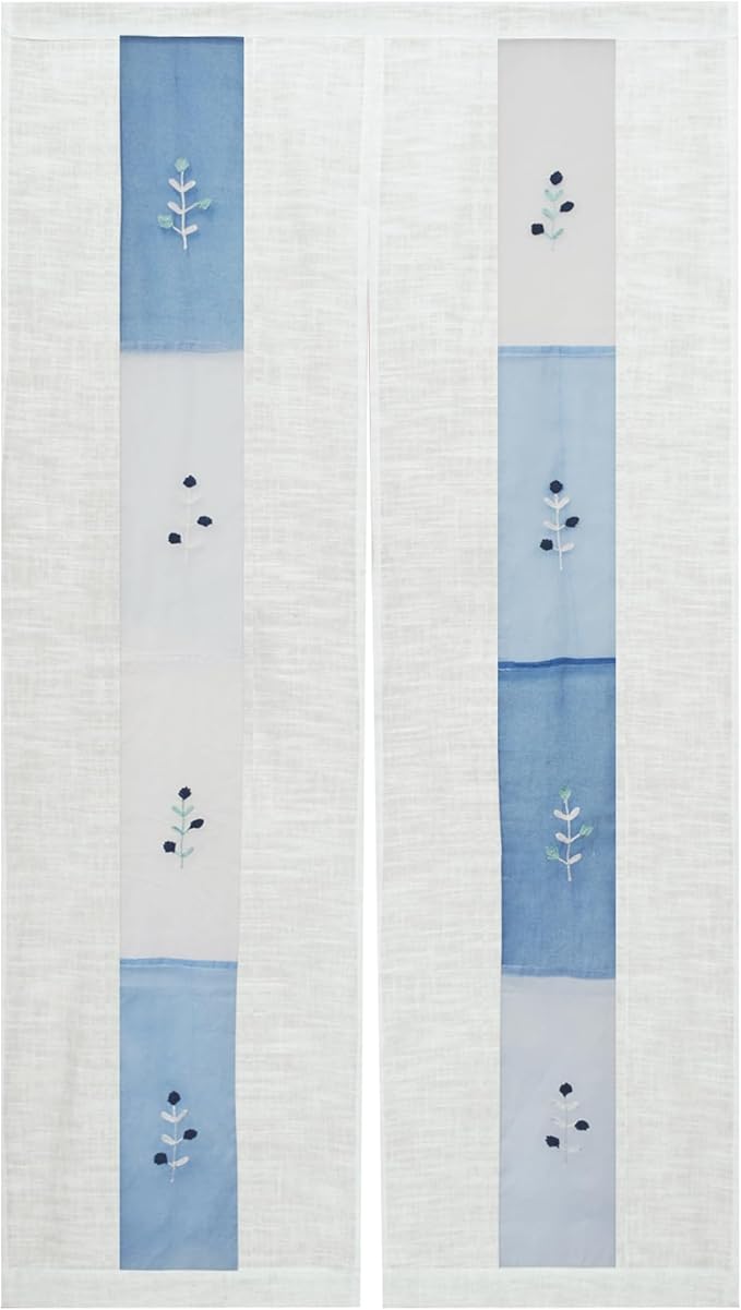 北欧テイストな雰囲気でブルーの透け感がきれいなオーガンジー暖簾。中窓に咲く小花のモチーフは刺繍になっていて、ナチュラルなイメージをプラス。主張しすぎないやさしいデザイン性はお部屋の雰囲気を選ばず、 リビング、ダイニングはもちろんパントリー等の目隠しとしてもお使いいただけます。