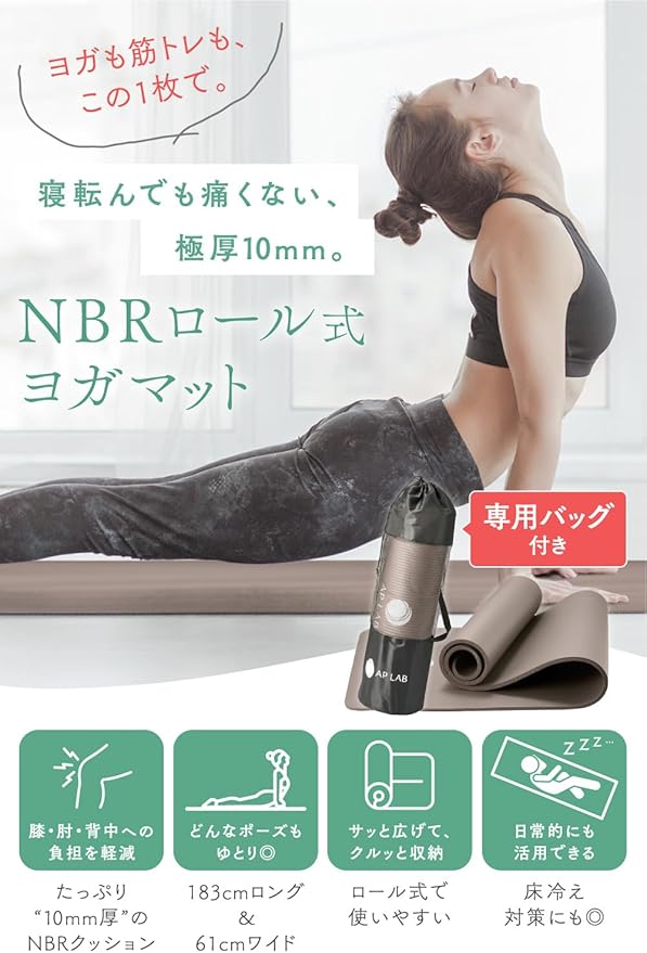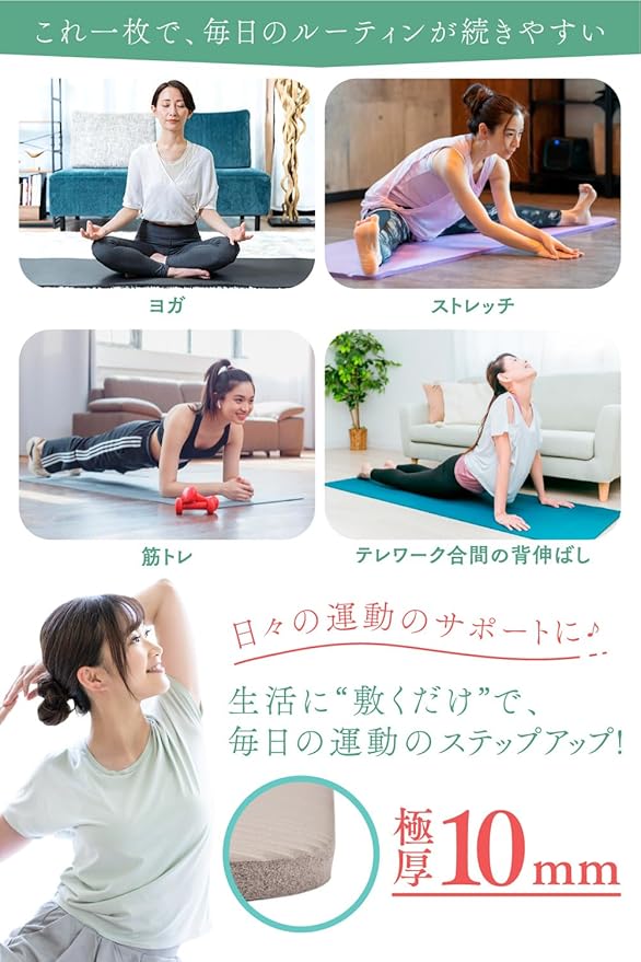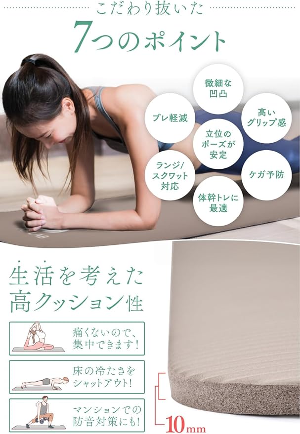 ✅【厚手10mmのクッション性で身体にやさしい】 弾力性のある厚さ10mmのマットを採用しており、ひざ・ひじ・腰などへの負担を大きく軽減してくれます。身体が痛くなりにくいので、ヨガやトレーニングに集中することができます。初心者でも安心して使用でき、快適にヨガや筋トレを続けられるマットとして最適です。