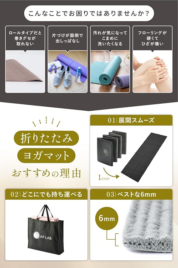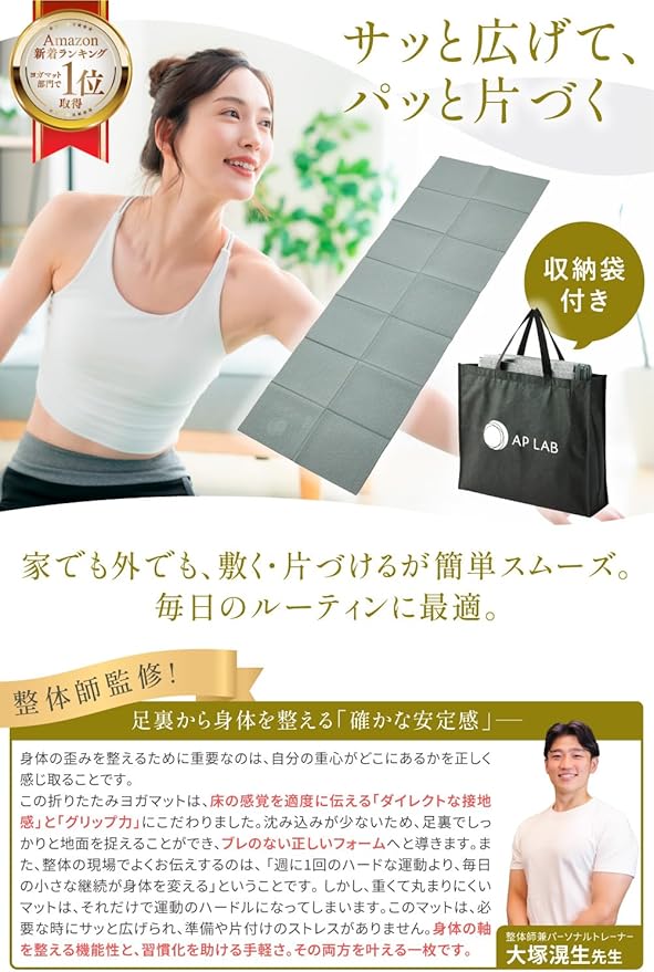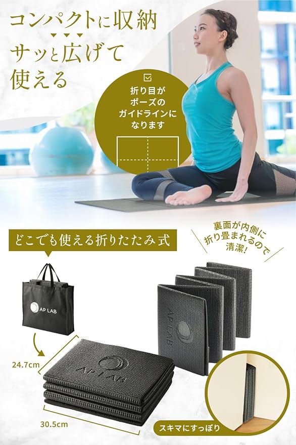 ✅【持ち運びに便利な折りたたみ式&専用収納袋付き】 AP LABのヨガマットは、折りたたみ式デザインでコンパクトに収納可能。使用後はサッと畳んで、付属の収納バッグに入れれば、ジムやスタジオへの移動もスムーズです。限られた収納スペースでも場所を取らず、車での持ち運びや旅行先にも最適なマットです。
