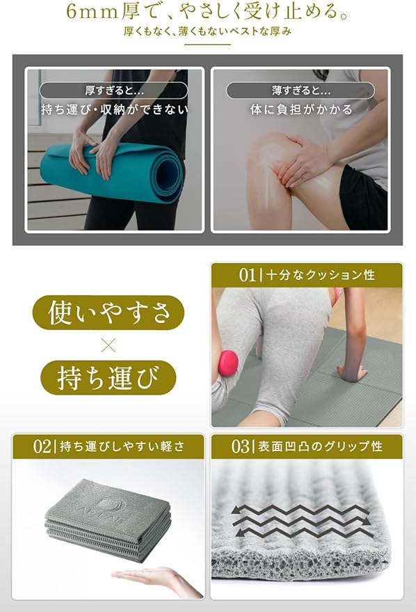 ✅【長時間利用OKのクッション性】 厚みのあるクッションが、フローリングや固い床でもしっかり身体をサポート。膝・腰・肘などへの負担を軽減し、長時間のヨガや筋トレ、ストレッチでも快適に使えます。さらに、クッション性と反発性を兼ね備えており、安定感のあるポージングも可能。初心者から本格派まで幅広いユーザーにおすすめできるヨガマットです。