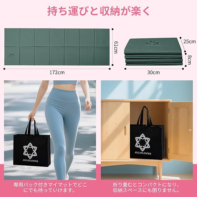 【超軽量&コンパクト収納】AULIFLOWERの折りたたみヨガマットは従来のロール状マットより約60%省スペース!折りたたみサイズはわずか30 25 6cm、0.9kgの軽量設計で、バッグやスーツケースにもすっきり収納。通勤や旅行先でも手軽にヨガを楽しめます。 ヨガ教室・ホットヨガ・ピラティス・ストレッチ・筋トレ・リハビリに適当です。