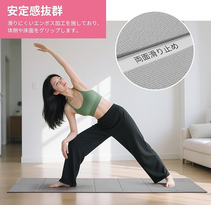 【ズレない両面滑り止め】ヨガマットのは両面凹凸エンボス加工を施しており、グリップ力に優れています。汗をかいても手足がずれず、集中力をキープできます。
