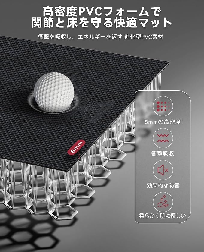 厚め8mmの高密度PVCで衝撃を吸収:8mm厚の高密度PVC素材がトレーニング中の衝撃を吸収し、膝や腰への負担を減らす。