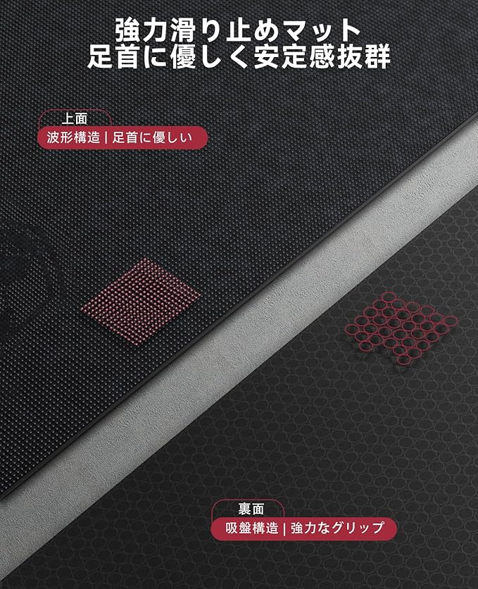 滑り止め設計で安定感を確保:波形表面と吸盤裏面がマットを固定し、激しい筋トレでもズレずに安定した動きをサポート。