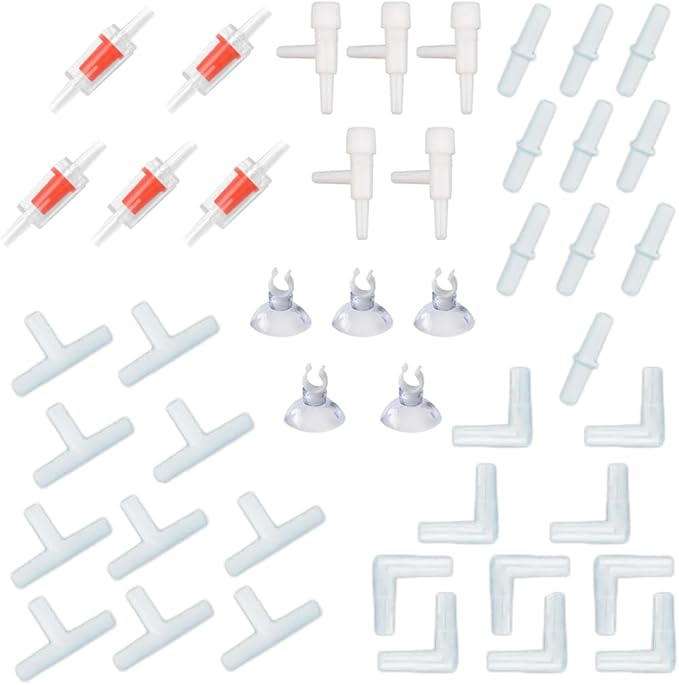 【パッケージ内容】エアーチューブコネクタ 30個セット 10xT型コネクタ 10x L型コネクタ 10x I型コネクタ 、5x逆流防止弁 5xエアーバルブ 5x水槽 吸盤クリップ