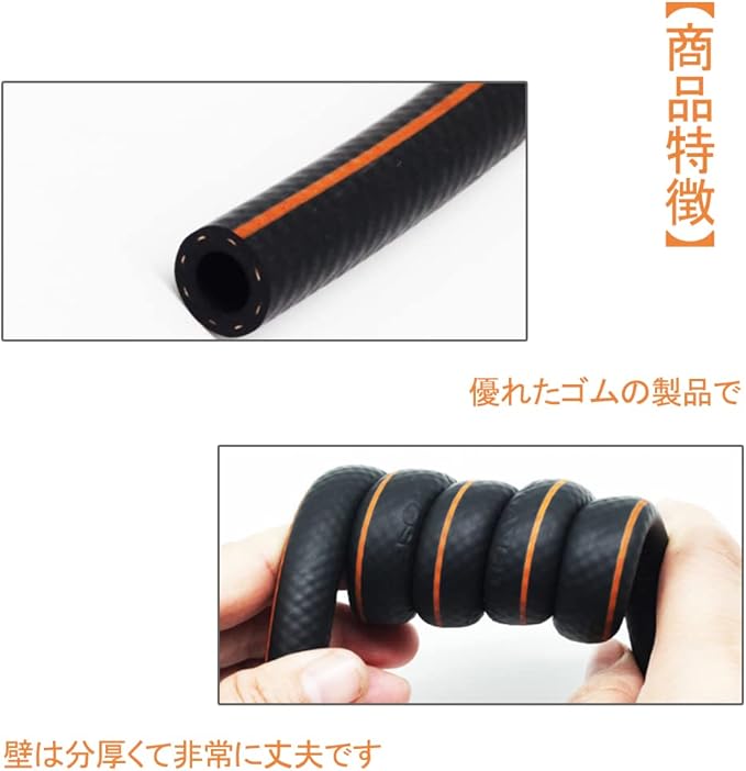 【商品情報】本製品の原材料はニトリルゴム(NBR)です。しっかりの3層構造:内側が耐油ゴム製、中間層が耐圧構造の合成繊維製、外側が耐熱ネオプレーン製です。作業圧力:300psi(20.6bar)、破裂圧力1200psi(82.7bar)、耐熱温度:-30℃~120℃。