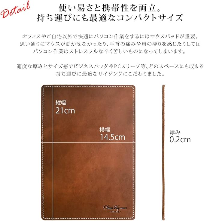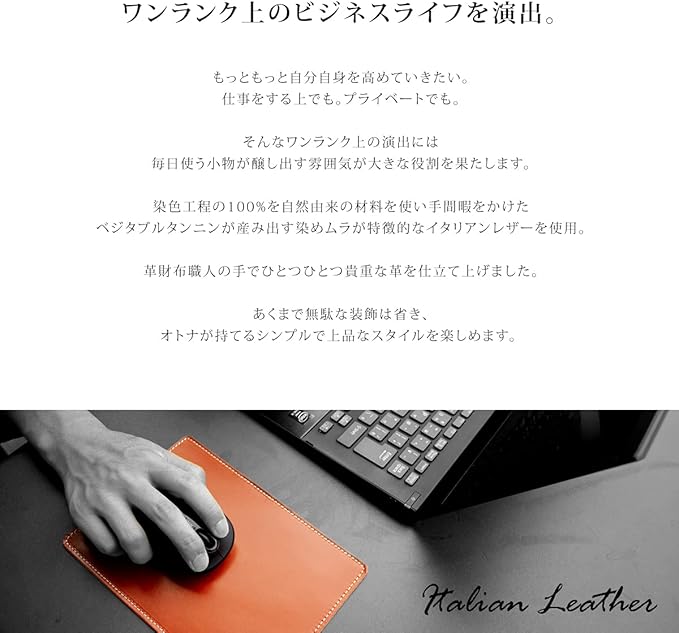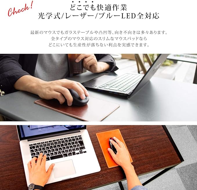 【職人仕上げ 本革マウスパッド】 革の持つあたたかみや素材感を楽しめるマウスパッドです。持ち運びや小さめスペースにもぴったりなコンパクトサイズ。光学式・IR LED式・BlueLED式・レザー式 など幅広いタイプのマウスに対応しています。