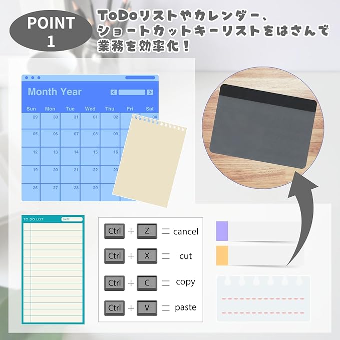 このマウスパッドは、ただのマウス操作スペースにとどまりません。透明カバーの下に、メモや写真、ToDoリストなどを自由に挟める便利なデザイン。オフィスや在宅ワークの机をスッキリ整理しながら、必要な情報をすぐ確認できるのが魅力です。おしゃれでシンプルな見た目は、どんなデスクにもマッチします。仕事効率も気分もアップする、ちょっと嬉しい工夫が詰まったアイテムです。